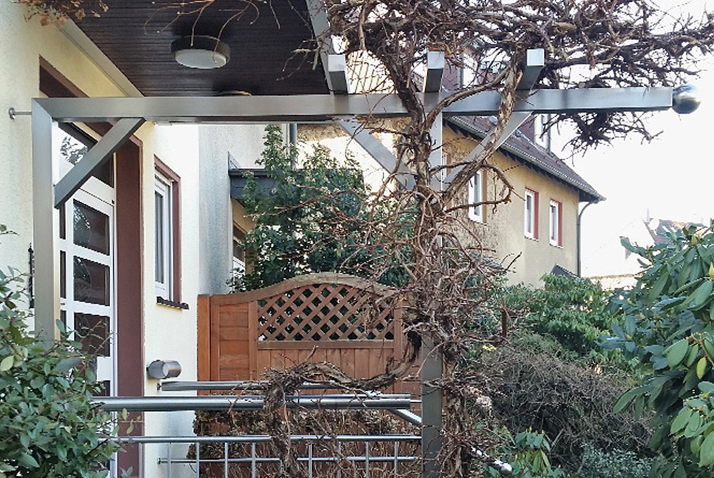 Ein ganz besonderes Rankgerüst aus gebürstetem Edelstahl fertigte Nappenfeld am Eingang eines [...]