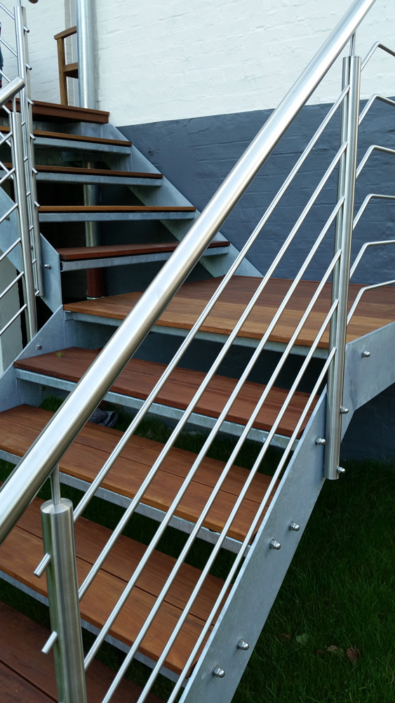 Eine moderne Aufgangstreppe vom Garten zum Balkon hat Nappenfeld für ein Mehrfamilienhaus in Mülheim entworfen und gefertigt. Die Edelstahlgeländer in Kombination mit Bankiraiholz wirken sehr elegant. Ein weiterer Vorteil: Dank der an der Außenwand angebrachten Konstruktion konnte der Balkon gar um einen Meter erweitert werden.