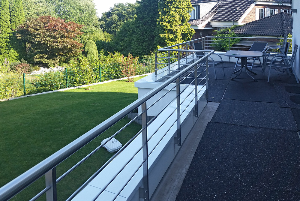 In Mülheim ist der Balkon einer Villa jetzt auch vom Garten aus über eine Treppe zu erreichen. Das Edelstahlgeländer in Kombination mit Bankiraiholz wirken sehr elegant. Insgesamt wurden 61m Edelstahlgeländer auf zwei Etagen verbaut.