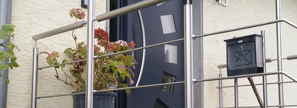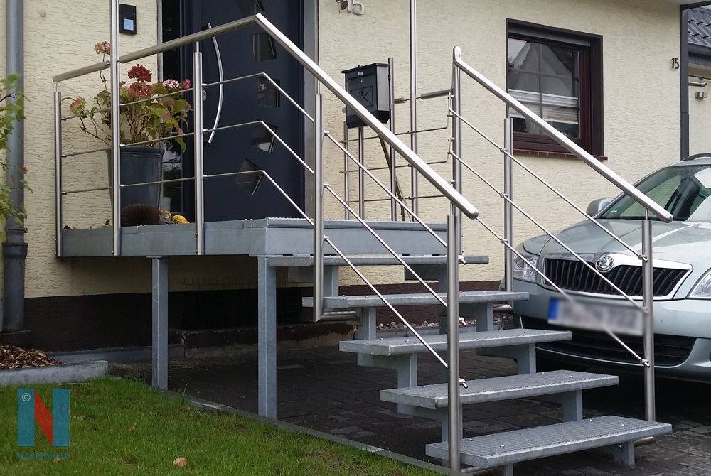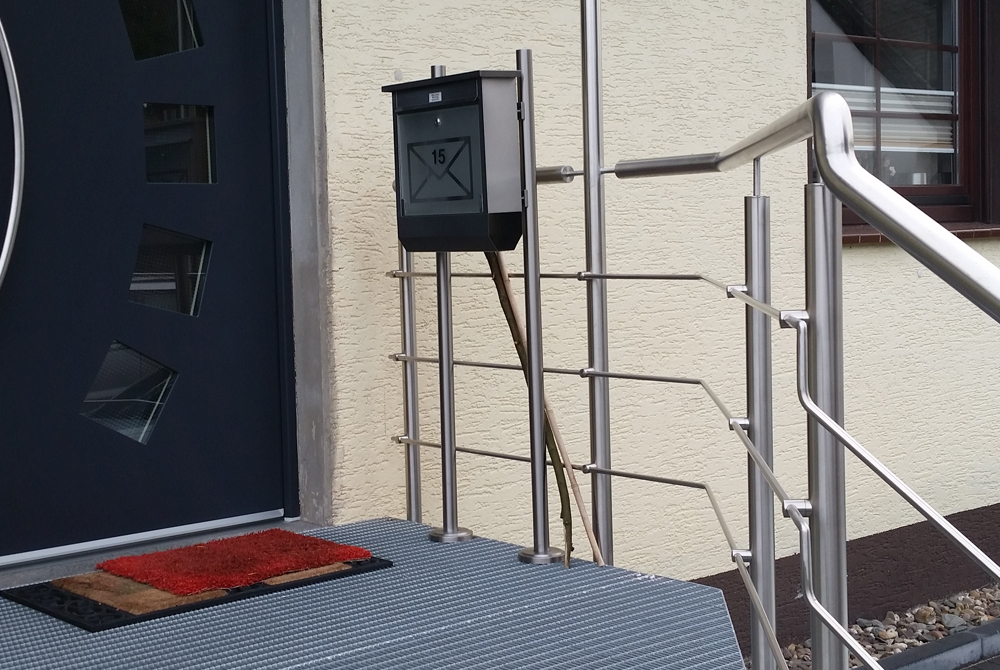 Für ein Einfamilienhaus in Mülheim hat Nappenfeld eine Treppenanlage mit Vordachkonstruktion entworfen und realisiert. Das Treppengeländer aus poliertem Edelstahl besteht jeweils aus drei Querstreben und einer stahlfeuerverzinkten Unterkonstruktion. Die Besonderheit: Die Briefkastenanlage wurde am Geländer mit zwei zusätzlichen Stützen vorgebaut.