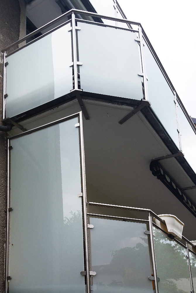 An einem Mehrfamilienhaus in Duisburg frischte Balkonprofi Nappenfeld vier Balkone auf. Die unattraktiven Balkonplatten und die Dachrinne wurden durch heruntergezogene Sicherheitsscheiben verdeckt. Auch das neue Geländer aus Edelstahl kann sich wirklich sehen lassen.