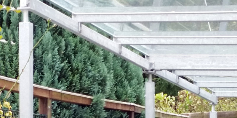 In Mülheim hat Nappenfeld einen 3,50 m x 6 m großen Carport parallel zur Hanglage gebaut. Getragen wird das Dach aus Sicherheitsglas von 6 Stahlpfeilern. Die Konstruktion ist geneigt und trägt an der niedrigen Seite eine Dachrinne aus Stahl.
