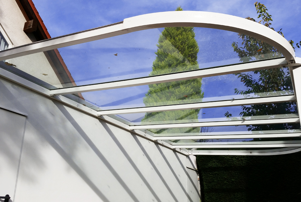 In Mülheim hat Nappenfeld einen 6 m x 3 m großen Carport mit abgerundeten Profilen parallel zur Garagenwand angebaut. Getragen wird das Dach aus Sicherheitsglas von zwei Standstützen.