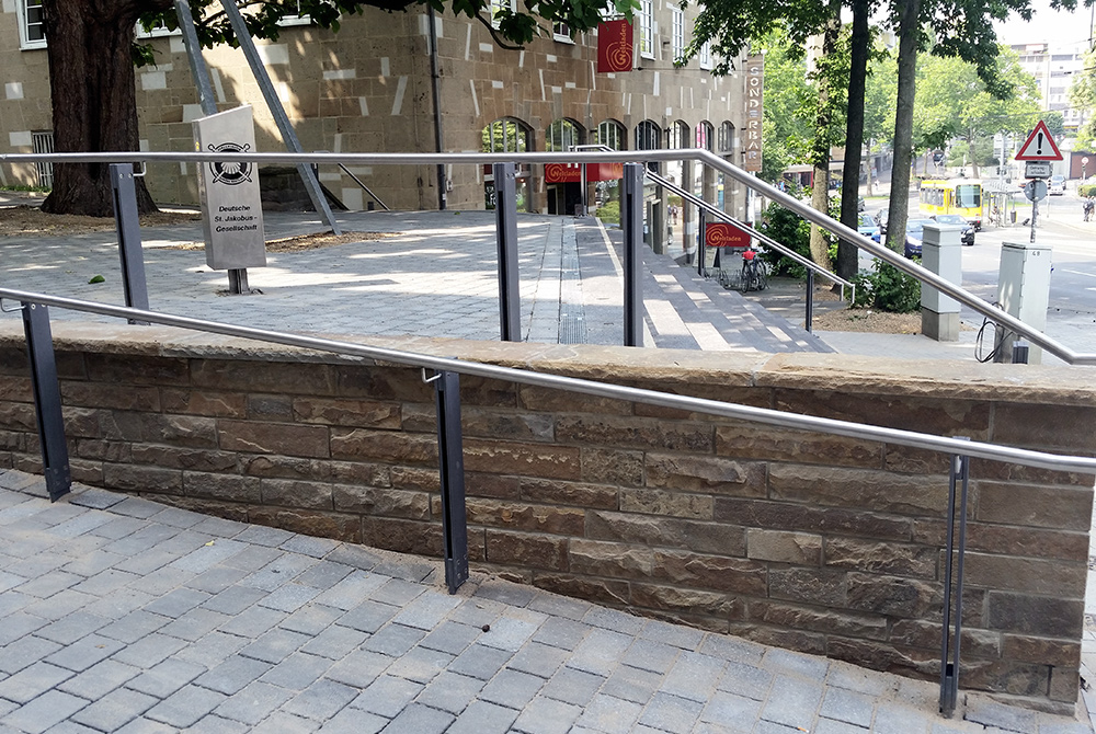 Nappenfeld arbeitet nicht nur für private Kunden sondern fertigt auch Arbeiten im öffentlichem Bereich an. In der Mülheimer Stadtmitte realisierte das Unternehmen ein Handlauf aus Edelstahl in Kombination mit verzinkten und sonderlackierten Stützen in DB 703.