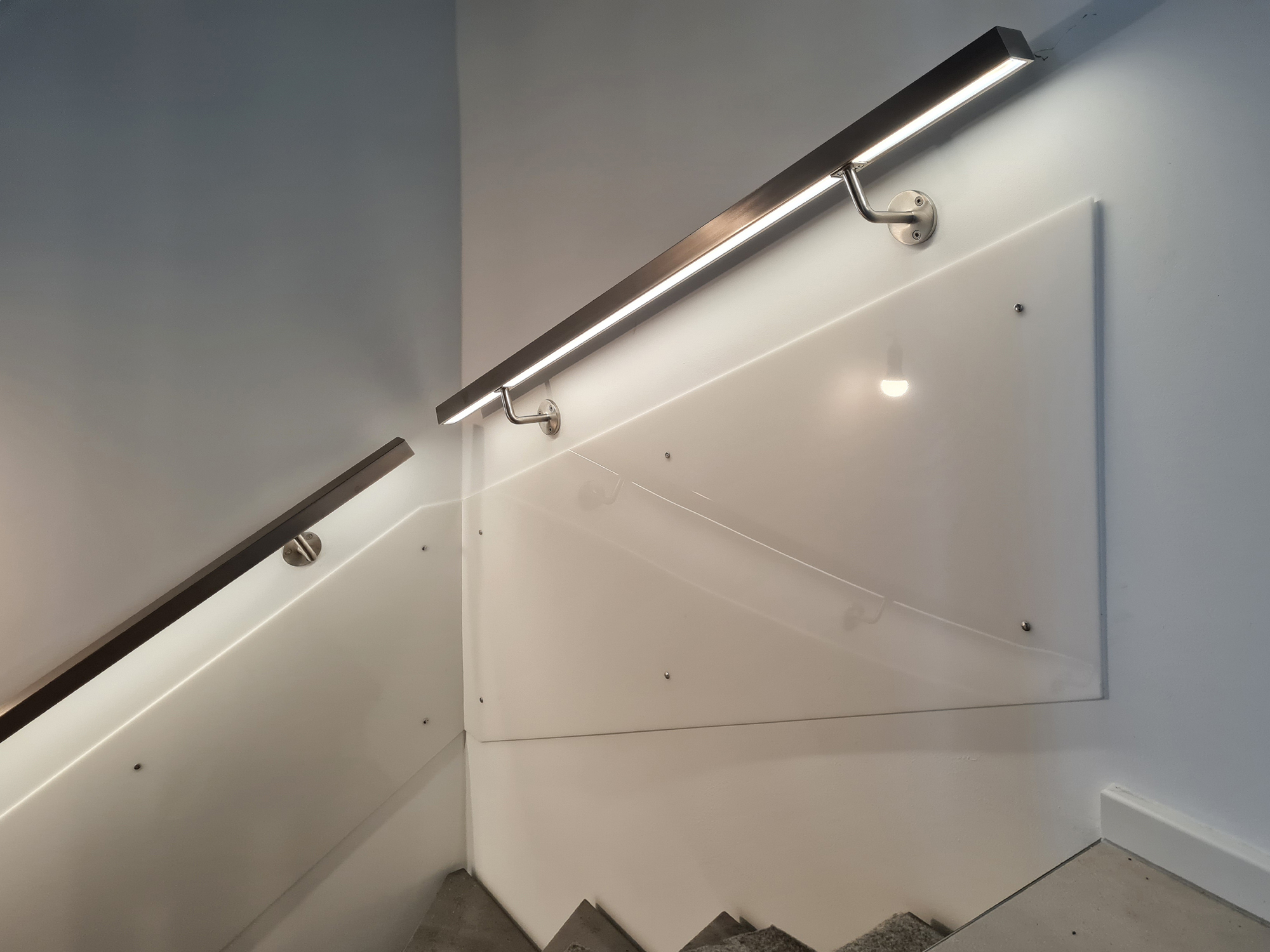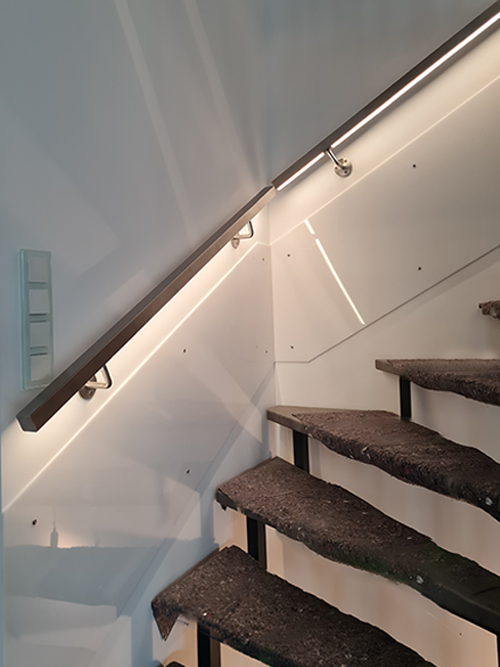 Ein moderner Edelstahl-Handlauf mit integrierter LED-Beleuchtung ziert nun das Treppenhaus in Mülheim and der Ruhr. Die Installation umfasst drei Etagen und sorgt für eine stilvolle Ausleuchtung der Stufen. Die Besonderheit: das quadratische Profil des Handlaufs, an dessen Unterseite die LED-Beleuchtung geschickt integriert wurde. Für ein gelungenes Erscheinungsbild sind die Kabel vor der Montage in der Wand platziert worden. Das Ergebnis ist ein Edelstahl-Geländer im modernen Stil.
