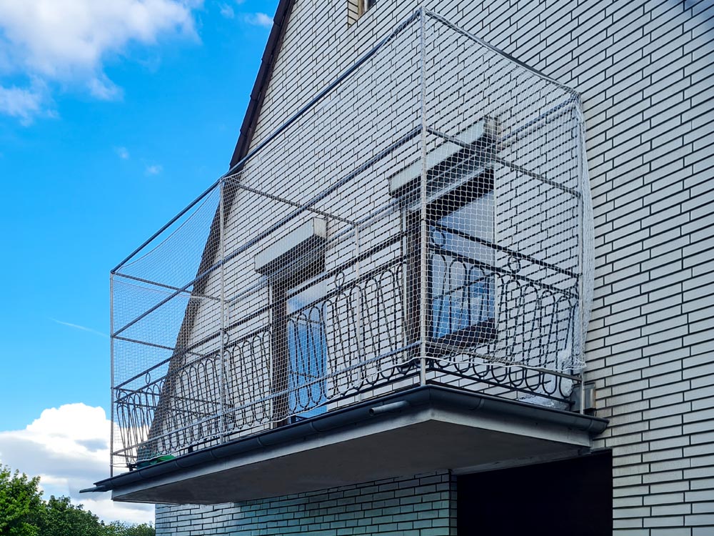 Sicherheit auf dem Balkon: In Mülheim an der Ruhr hat die Edelstahlschlosserei Nappenfeld eine maßgefertigte Edelstahl-Konstruktion mit Netz für einen Balkon hergestellt und montiert. Das Grundgerüst aus Edelstahl-Vierkantrohren umschließt den gesamten Balkonbereich und ist mit einem engmaschigen Netz bespannt. Die Konstruktion wurde in Einzelteilen gefertigt und vor Ort passgenau zusammengesetzt – so ließ sich die Montage auch in der Höhe problemlos umsetzen.