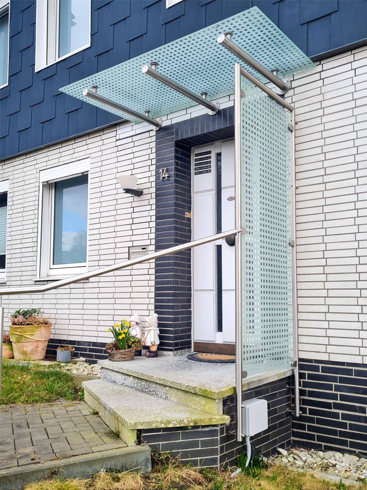 Komplett erneuert wurde der Hauseingang eines modernen Mehrfamilienhauses in Ratingen durch die Edelstahlschlosserei Nappenfeld. Die Besonderheit: Das großzügige Vordach besticht durch strukturiertes, satiniertes Glas mit geometrischem Muster. Die seitliche Verkleidung aus gleichem Material sorgt für zusätzlichen Wetterschutz und eine einheitliche Optik. Die Profis der Bauschlosserei Nappenfeld haben das Projekt von der Planung über die Fertigung bis zur fachgerechten Montage betreut.