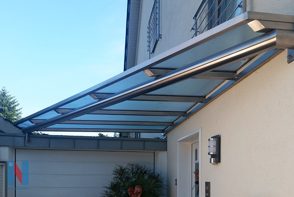 Für ein Einfamilienhaus hat Nappenfeld eine Vordachskonstruktion entworfen und realisiert. Die maßangefertigte Konstruktion aus Edelstahl in Kombination mit Milchglas läuft schräg auf die Garage zu. Diese individuelle Vordach-Anfertigung verleiht dem Hauseingang ein modernes und einladendes Aussehen.