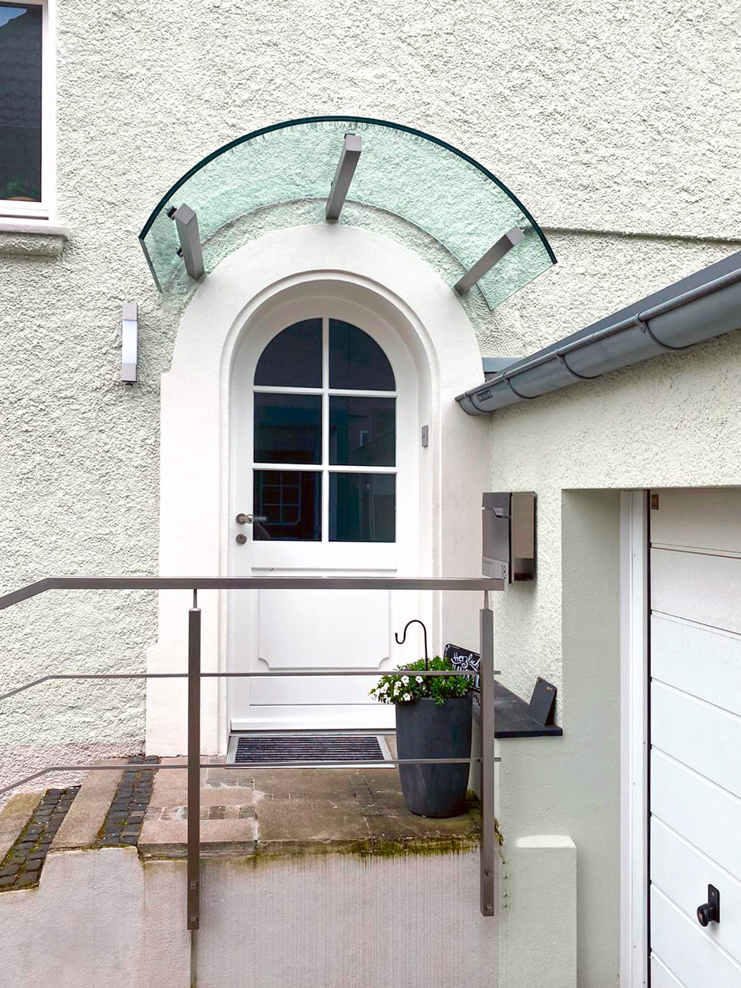 Die Bauschlosserei Nappenfeld hat ein maßgeschneidertes Edelstahl-Vordach mit Glas montiert. Das Besondere: Die Sonderanfertigung ist speziell nach den Wünschen der Kunden aus Mettmann gefertigt und passt sich optimal an die Rundung des Türbogens an. Drei kantige Edelstahlträger bieten Stabilität und stützen das Vordach von unten. Nun wird der Eingangsbereich vor direkter Witterung geschützt. Von der Fertigung über die Lieferung bis hin zur Montage – alle Arbeitsschritte wurden von den Profis der Edelstahlschlosserei Nappenfeld übernommen.