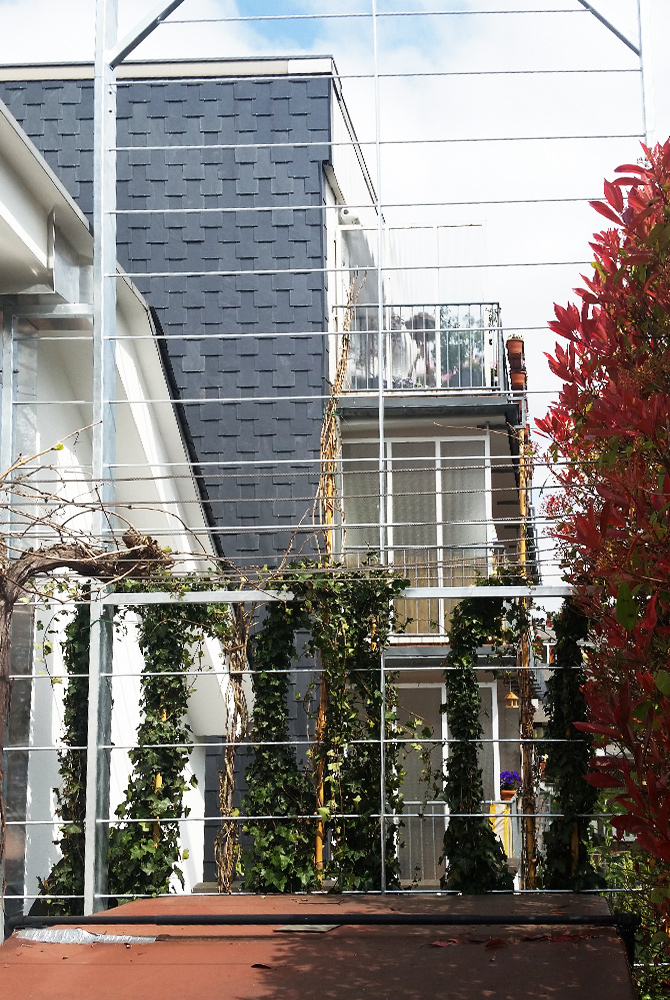 Ein natürlicher Sichtschutz sorgt auf einem Balkon in Mülheim an der Ruhr ab sofort für Wohlfühlstimmung. Nappenfeld fertigte für das Reihenhaus ein individuelles Rankgerüst in verzinkter Ausführung an. Das Gerüst aus Stahl wurde vor Ort zusammen gebaut und an der Hauswand befestigt.