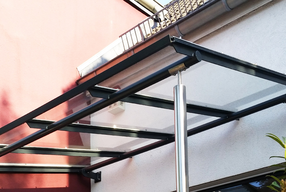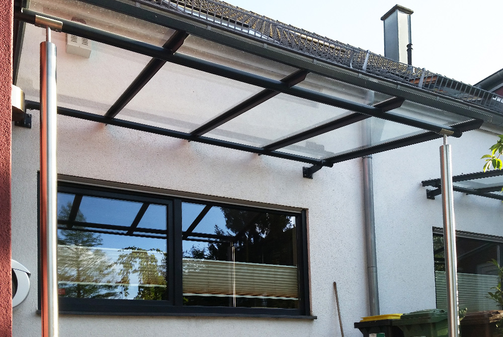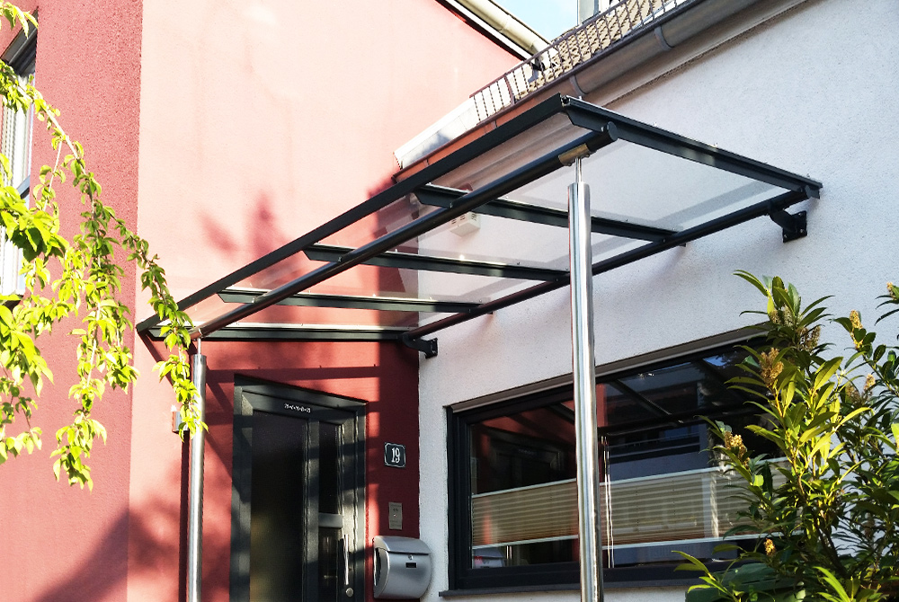 Die Konstruktion war ursprünglich nur für ein Einfamilienhaus gedacht. Auf zwei Stützkonsolen aus pulverbeschichtetem, verzinktem Stahl ruht das verlängerte Vordach. Die Kombination aus Edelstahl und Sicherheitsglas, passend zu den Fenstern des Hauses, sorgt für ausreichend Lichteinfall im Eingangsbereich und wertet das Gesamtbild des Hauses optisch auf.