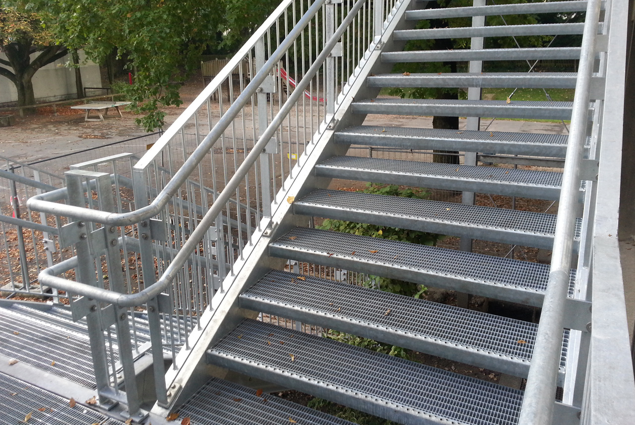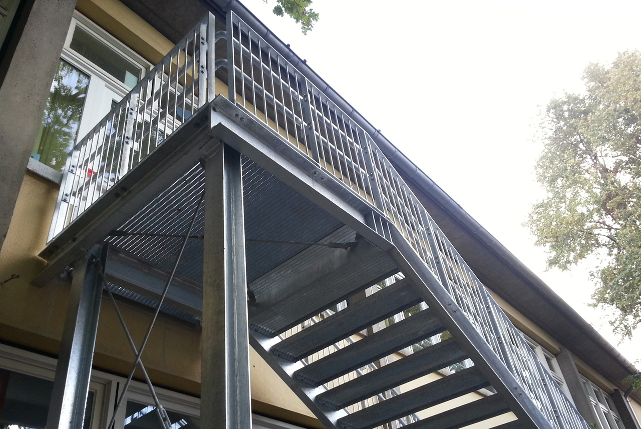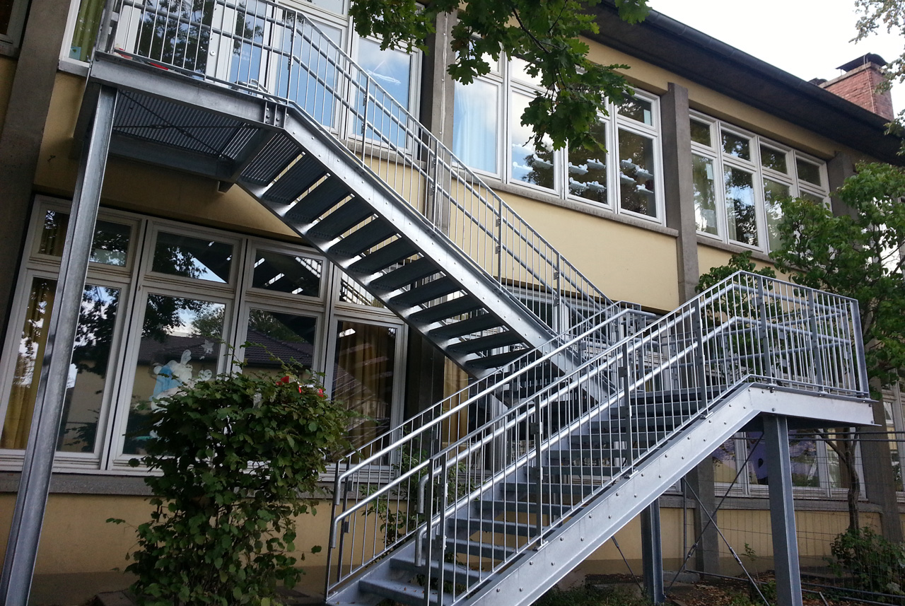 Für die städtische Kindertagesstätte Bärenhöhle in Mülheim an der Ruhr hat Nappenfeld eine Fluchttreppe geplant und gebaut. Die 27-stufige Konstruktion aus verzinktem Stahl und rutschhemmenden Gitterrosten wurde von außen an das KiTa-Gebäude angesetzt und montiert. In der Broicher Tageseinrichtung werden 56 Kinder im Alter von drei bis 14 Jahren montags bis freitags von 7 Uhr bis 16.30 Uhr betreut.