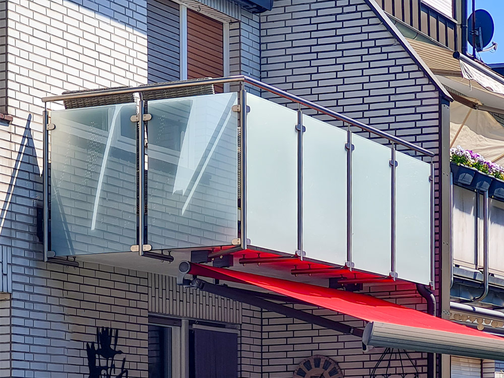 Die Edelstahlschlosserei Nappenfeld hat in Gelsenkirchen ein modernes Balkongeländer mit Glas gefertigt und montiert. Kundenwunsch: Der unschöne Beton sollte verdeckt werden – bei gleichzeitigem Sichtschutz für die Bewohner.