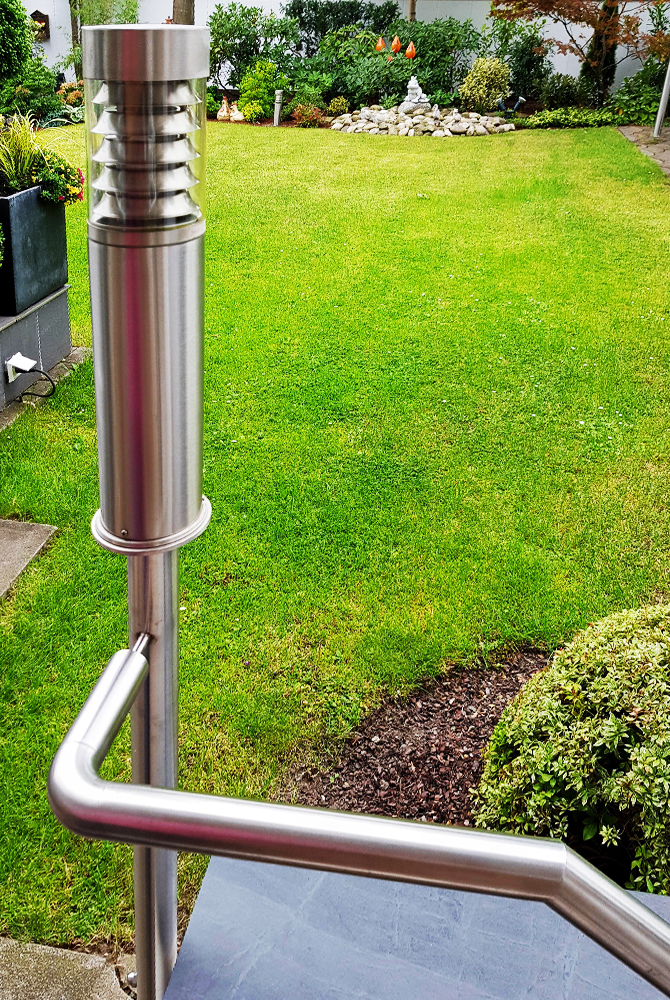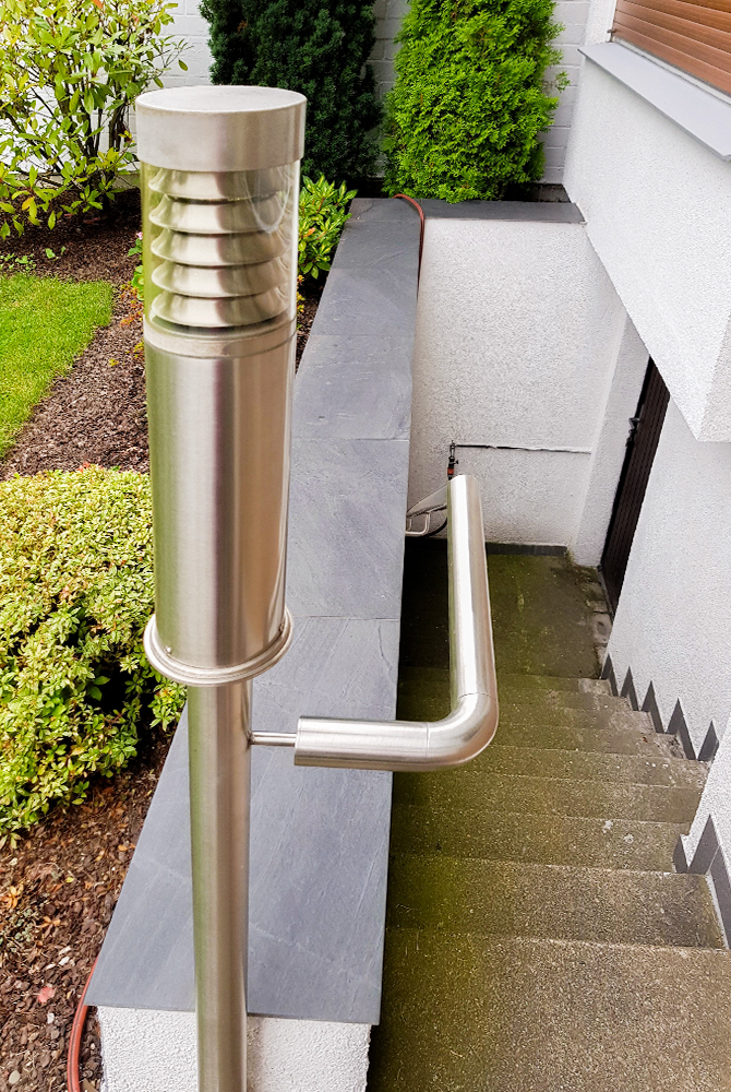 Nappenfeld realisierte einen pfiffigen Edelstahl-Handlauf für eine Außentreppe in Mülheim-Styrum. Die integrierten Strahler sorgen nicht nur für einen sicheren Tritt in der Dunkelheit, sondern sind auch ein echter Hingucker beim Blick von innen in den Garten. So macht der Weg in Garten und Keller auch abends Spaß.