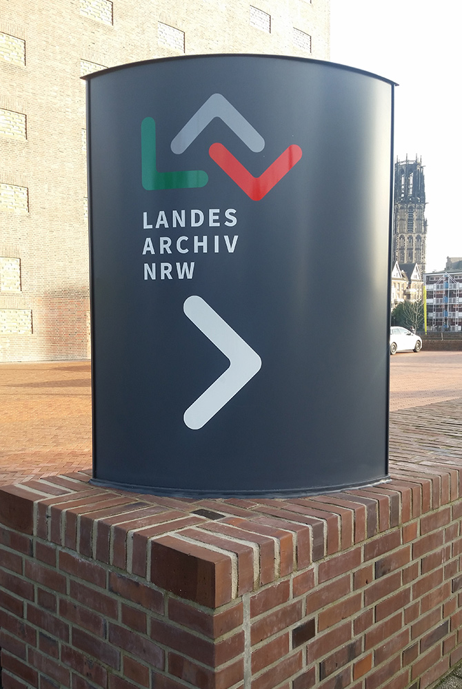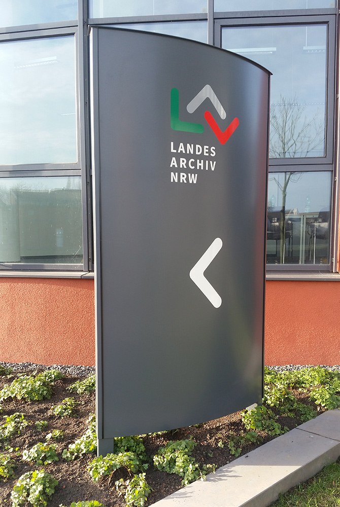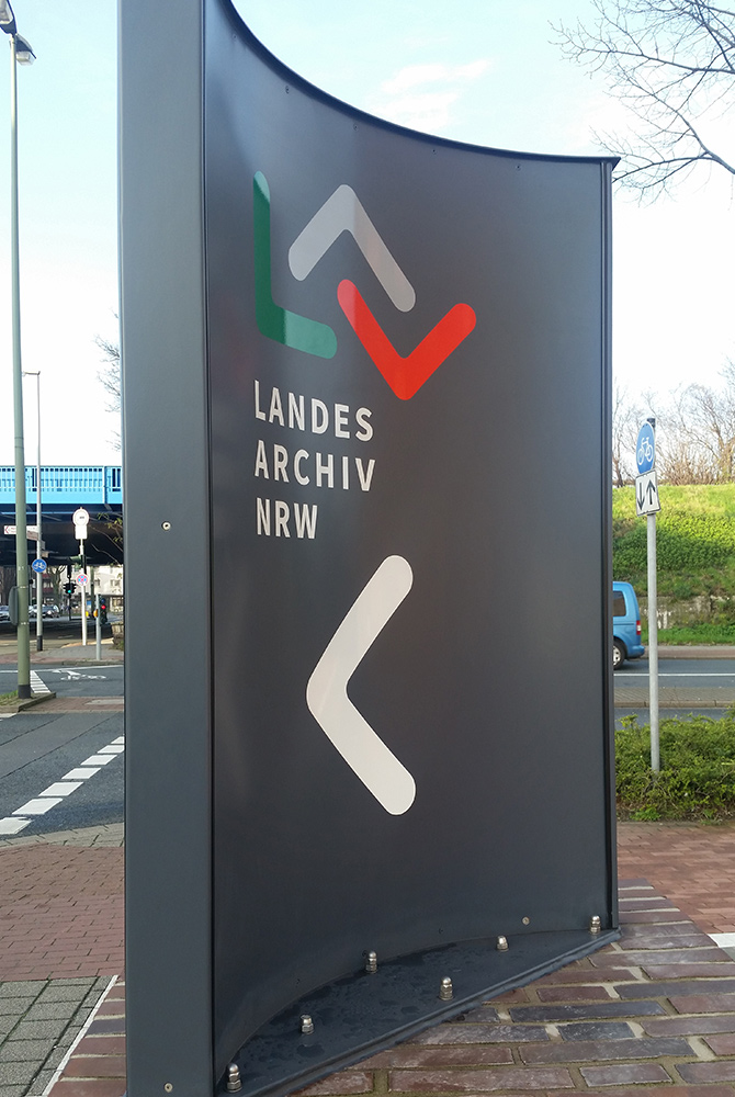 Für das Landesarchiv NRW, welches staatliche Behörden, Gerichte und Einrichtungen berät, fertigte Nappenfeld am Standort Duisburg mehrere Hinweisschilder. Die pulverbeschichteten Schilder wurden gebogen hergestellt und mit einer Reflexionsfolie beklebt.
