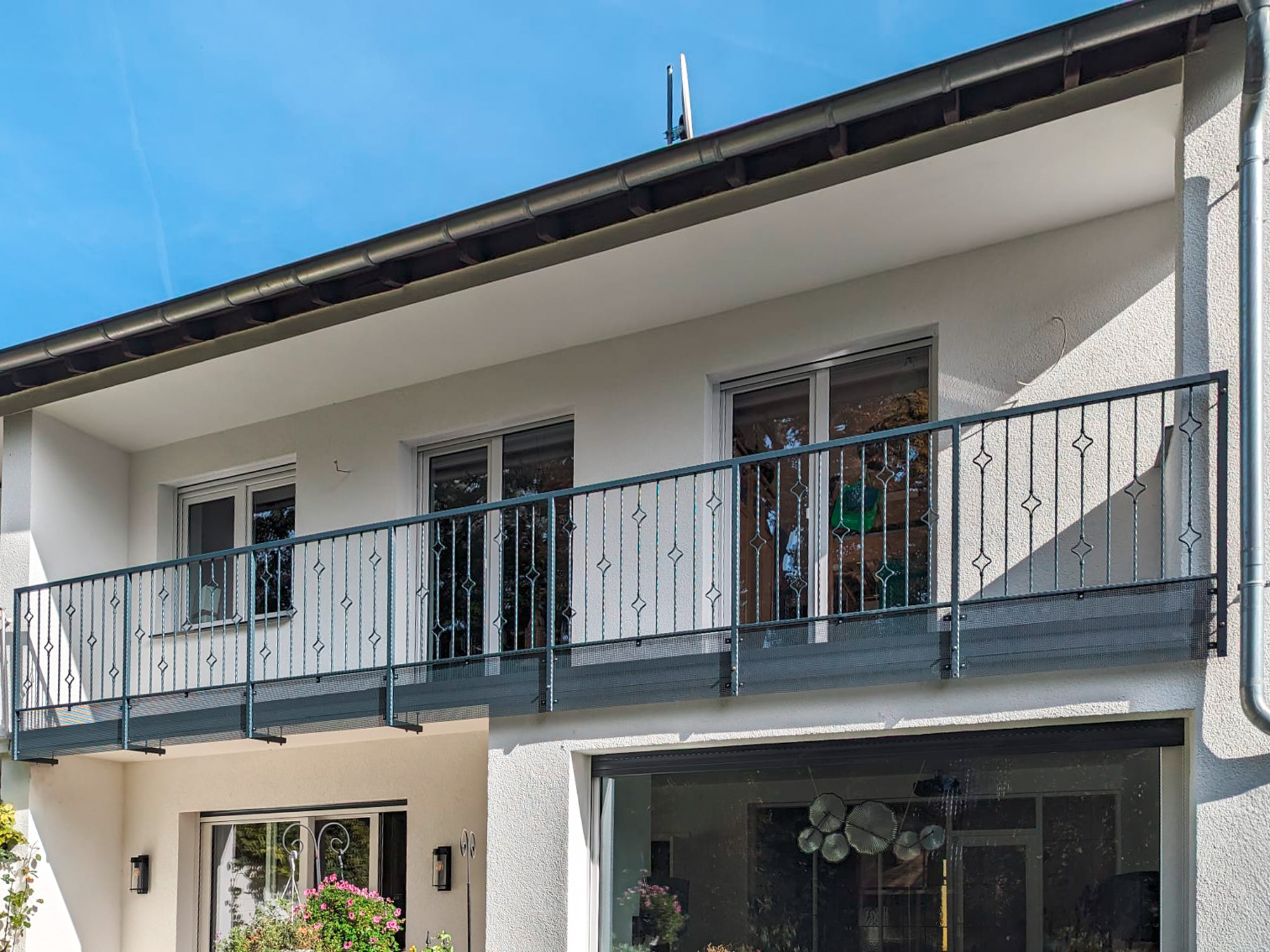 Die Edelstahlschlosserei Nappenfeld hat ein 8 Meter langes pulverbeschichtetes Geländer installiert, das sich durch seine kunstvollen Details auszeichnet. Die Besonderheit: stilvolle Elemente in Form von Rauten und in sich gedrehte Stäbe. Gestützt wird das Balkongeländer mittels von uns hergestellter Montagekonsolen. Ein weiteres Detail für die Kunden aus Duisburg: eine Lochblech-Verblendung am unteren Sockel. So wird die Kante stirnseitig verkleidet und der unschöne Boden geschickt verdeckt.