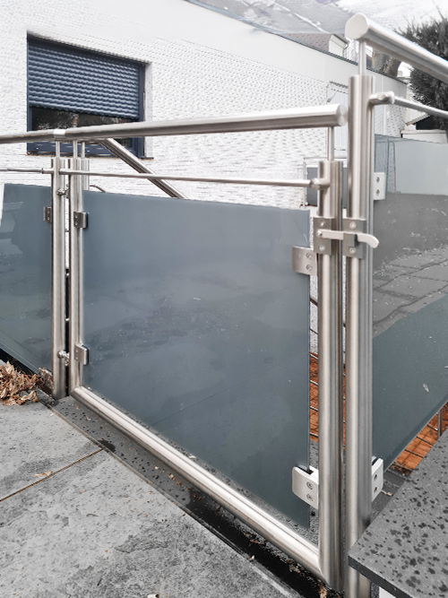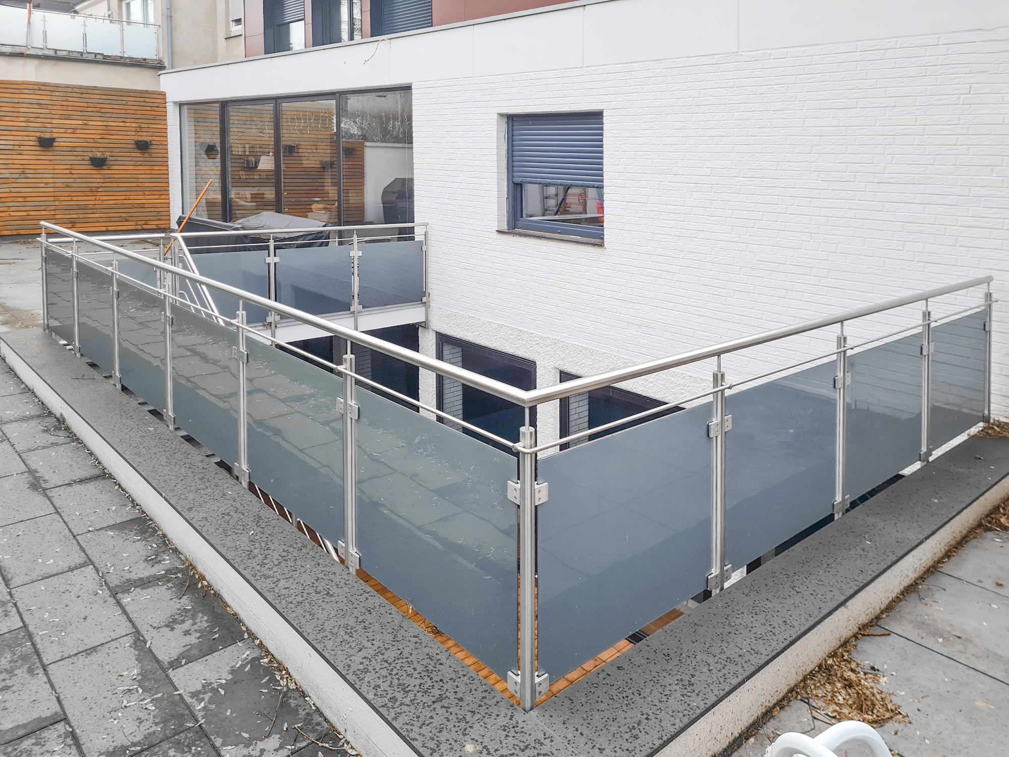 Projektabschluss: Die Profis der Edelstahlschlosserei Nappenfeld haben ein modernes Edelstahlgeländer mit dunkelgrauem Milchglas fertiggestellt. Wunsch der Kunden: Laub oder andere Naturmaterialien sollen weitestgehend abgehalten werden und nicht in den Schacht gelangen. Die Lösung: eine kleine Mauer am unteren Rand des Geländers. Zusätzlich bietet die integrierte Tür am Treppenaufgang Schutz für spielende Kinder. Auch bei diesem Projekt in Oberhausen hat Nappenfeld alles aus einer Hand geliefert, von der Planung bis zur Montage.