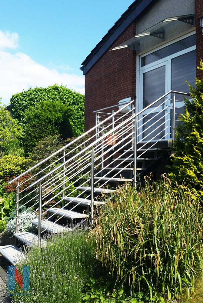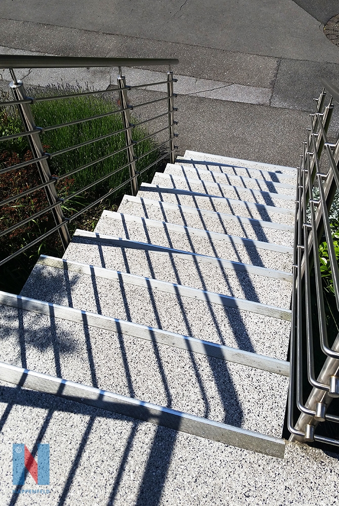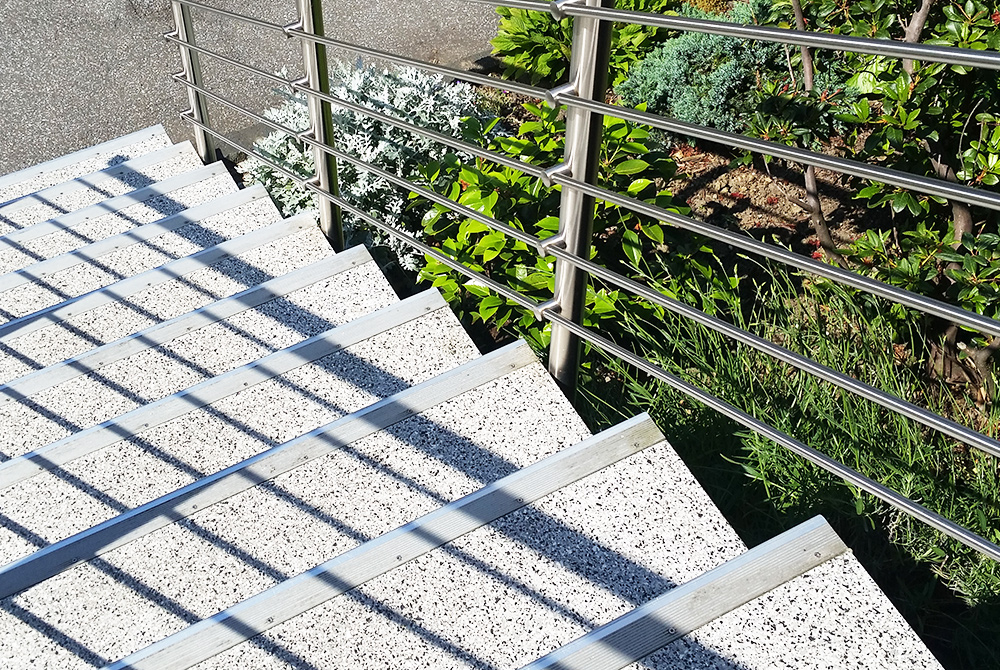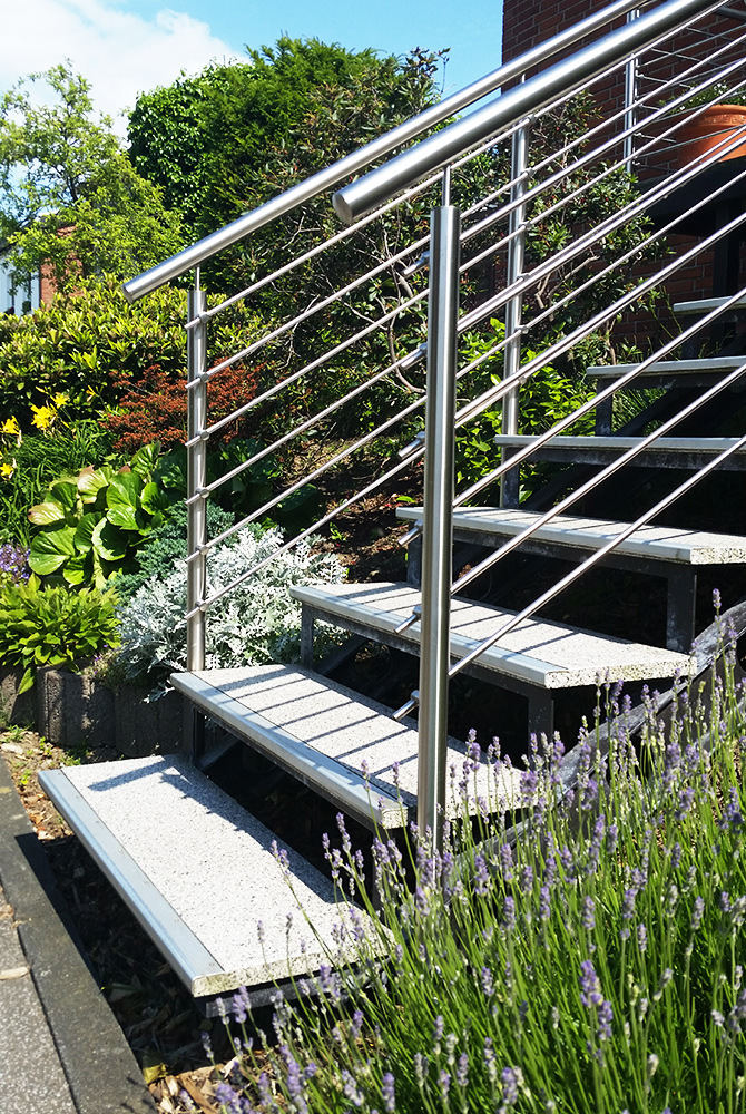 Hier montierte Nappenfeld eine Stahltreppe in Kombination mit einem eleganten Edelstahlgeländer und breiten BALKOPLAN-Stufen. Dabei handelt es sich um ein besonders wetterresistentes Material, das viel im Balkonbau eingesetzt wird. Die ökologischen Holzzementplatten bewähren sich besonders durch ihre wasserführende Oberfläche und als Dekorelement.