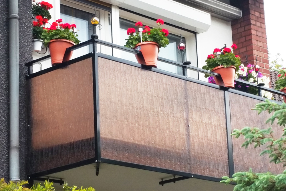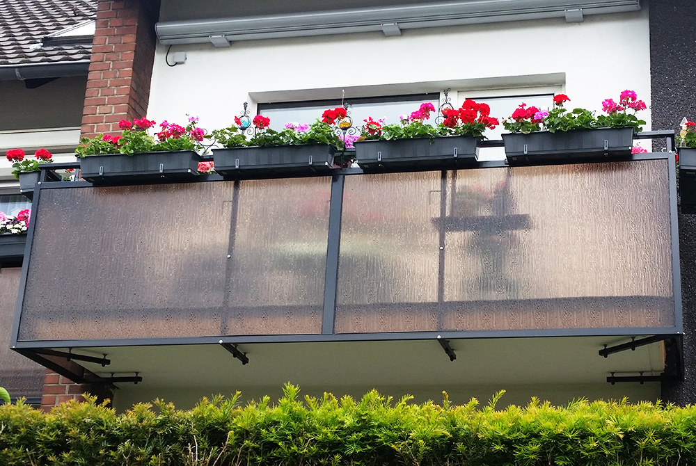 Balkonprofi Nappenfeld montierte in Mülheim ein pulverbeschichtetes Balkongeländer in Kombination mit einer Acrylglasverkleidung, die neben der optischen Aufwertung der Hausfassade auch als Blickschutz dient.