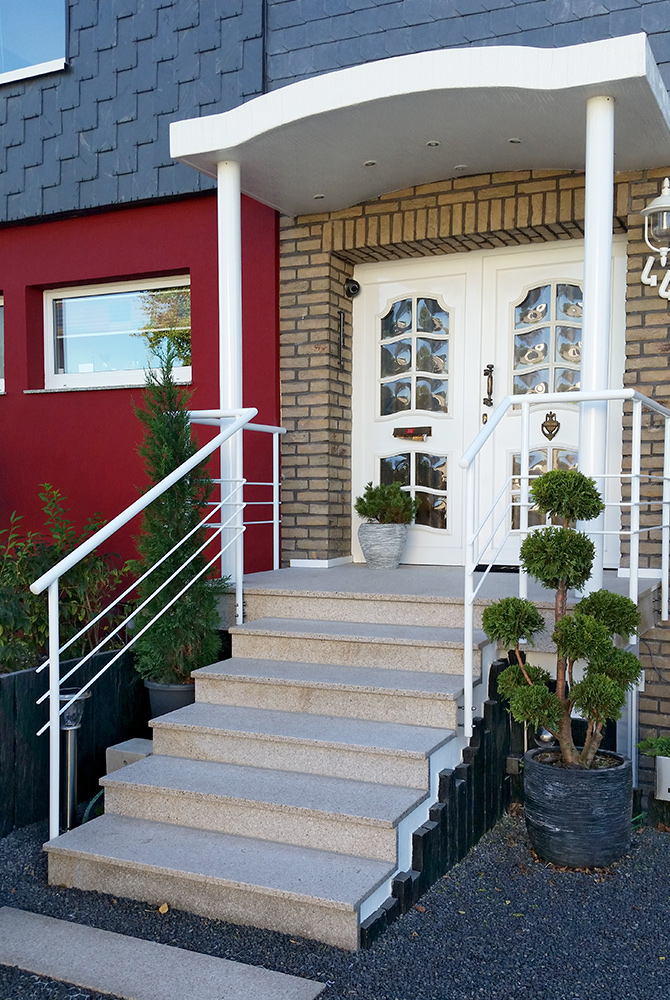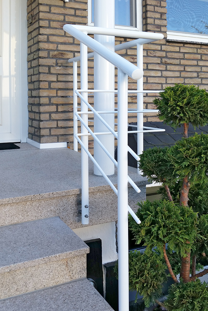 Nappenfeld realisierte in Mülheim ein neues Geländer für den Hauseingang eines Einfamilienhauses. Dieses schöne, individuelle Geländer ist verzinkt und weiß pulverbeschichtet. Die Besonderheit hierbei ist, dass es aus einem Guss gebaut wurde und somit kein billiger Baumarkt-Bausatz ist. Die Sonderanfertigung kann sich wirklich sehen lassen.
