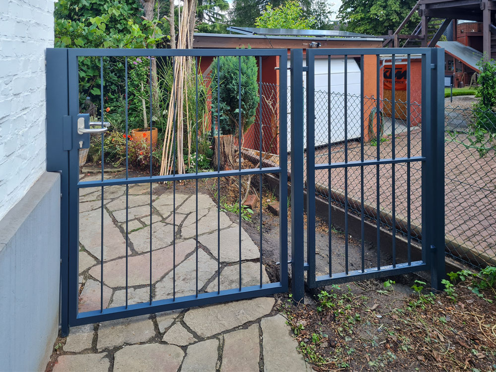 Neuer Projektabschluss in Mülheim an der Ruhr: Die Edelstahlschlosserei Nappenfeld hat eine pulverbeschichtete Toranlage mit feststehendem Seitenteil gefertigt und montiert. Die Anlage grenzt den Gartenbereich ab und sorgt für die gewünschte Privatsphäre. Das Tor ist mit einem abschließbaren Griff ausgestattet und lässt sich bequem öffnen und schließen. Die anthrazitfarbene Pulverbeschichtung schützt die Konstruktion dauerhaft vor Witterungseinflüssen und fügt sich stimmig in das Gesamtbild des Grundstücks ein.