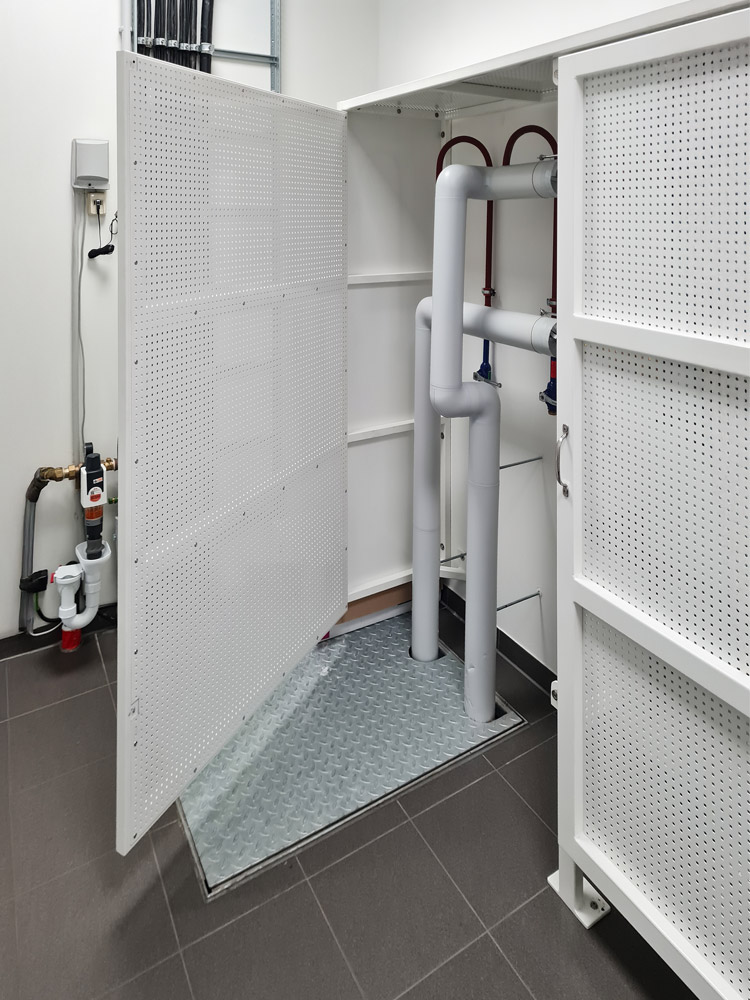 Für den TÜV Nord hat die Edelstahlschlosserei Nappenfeld eine elegante Lösung zur Verkleidung von Heizungsleitungen entwickelt. Der pulverbeschichtete Stahlschrank mit Lochblech-Füllung erfüllt alle gestellten Anforderungen – die Technik verschwindet diskret hinter der perforierten Oberfläche, während die notwendige Belüftung gewährleistet bleibt. Von der Planung über die Fertigung bis zur Montage haben die Profis der Bauschlosserei Nappenfeld alle Arbeitsschritte übernommen und eine maßgeschneiderte Lösung geschaffen, die Funktionalität und Ästhetik vereint.