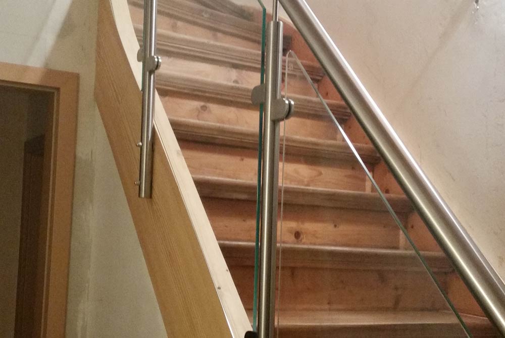 Ein Edelstahlgeländer in Kombination mit Sicherheitsglas fertigte Nappenfeld für eine Holztreppe in einem Einfamilienhaus. Diese Verknüpfung von Materialien verleiht innenarchitektonische Impulse für das Treppenhaus.