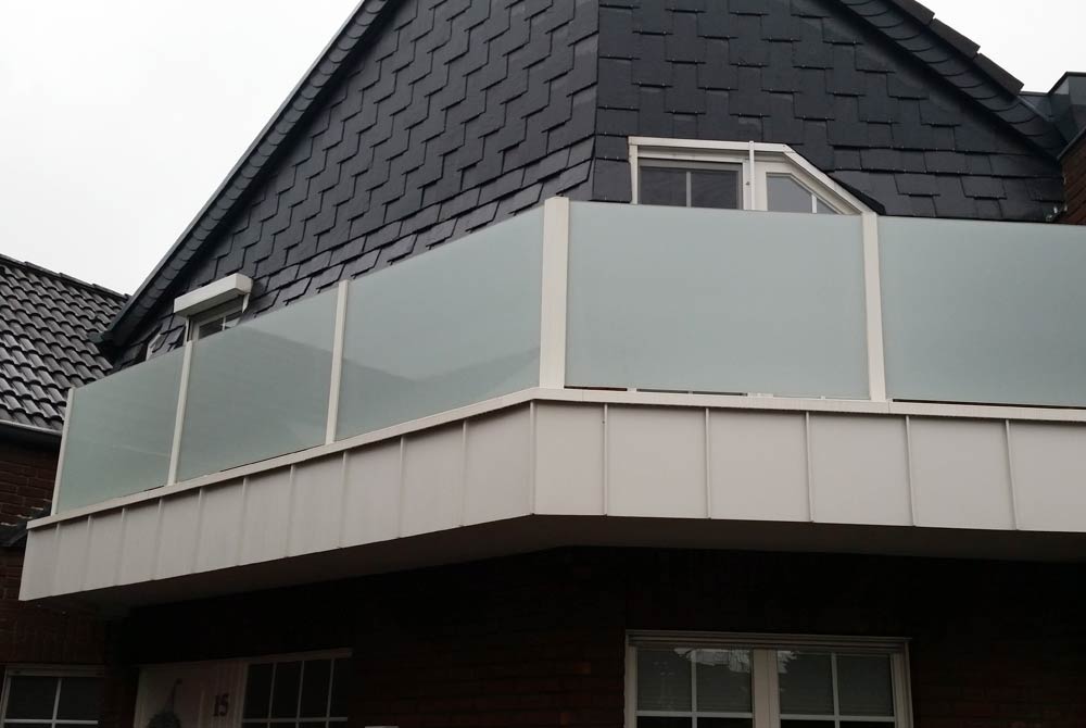 Die eckige Balkonkonstruktion in Kombination mit Sicherheitsscheiben aus Milchglas wirkt sehr edel.