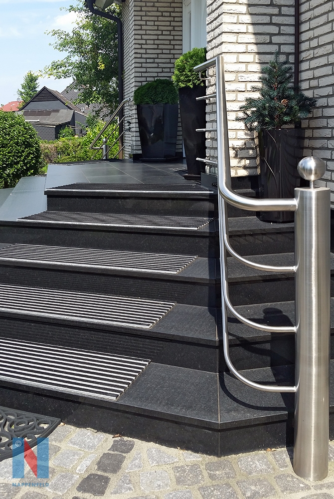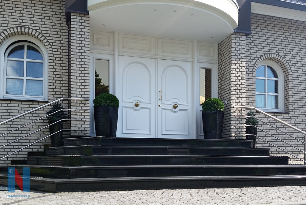 Wie man den Eingang einer repräsentativen Villa verschönert, zeigt die jüngste Referenz von Nappenfeld in Mülheim. Die fünf Stufen aus edlem schwarzen Marmor säumte Nappenfeld beidseitig mit einem eleganten Treppengeländer aus Edelstahl. Dieses Unikat besteht aus mehreren die vom Grundpfeilern bogenförmig abgehenden Rundrohre und verleihen der Gesamtoptik einen einzigartigen Charme und eine persönliche Note, ebenso wie die dekorativen Kugeln auf den Grundpfeilern.