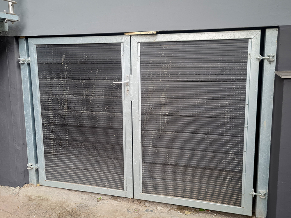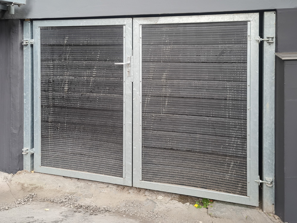Die Edelstahlschlosserei Nappenfeld hat in Essen eine maßgefertigte Tür-Anlage realisiert. Die verzinkte Konstruktion mit WPC-Verkleidung schließt eine Nische optimal ab und fügt sich harmonisch in die Gebäudearchitektur ein.