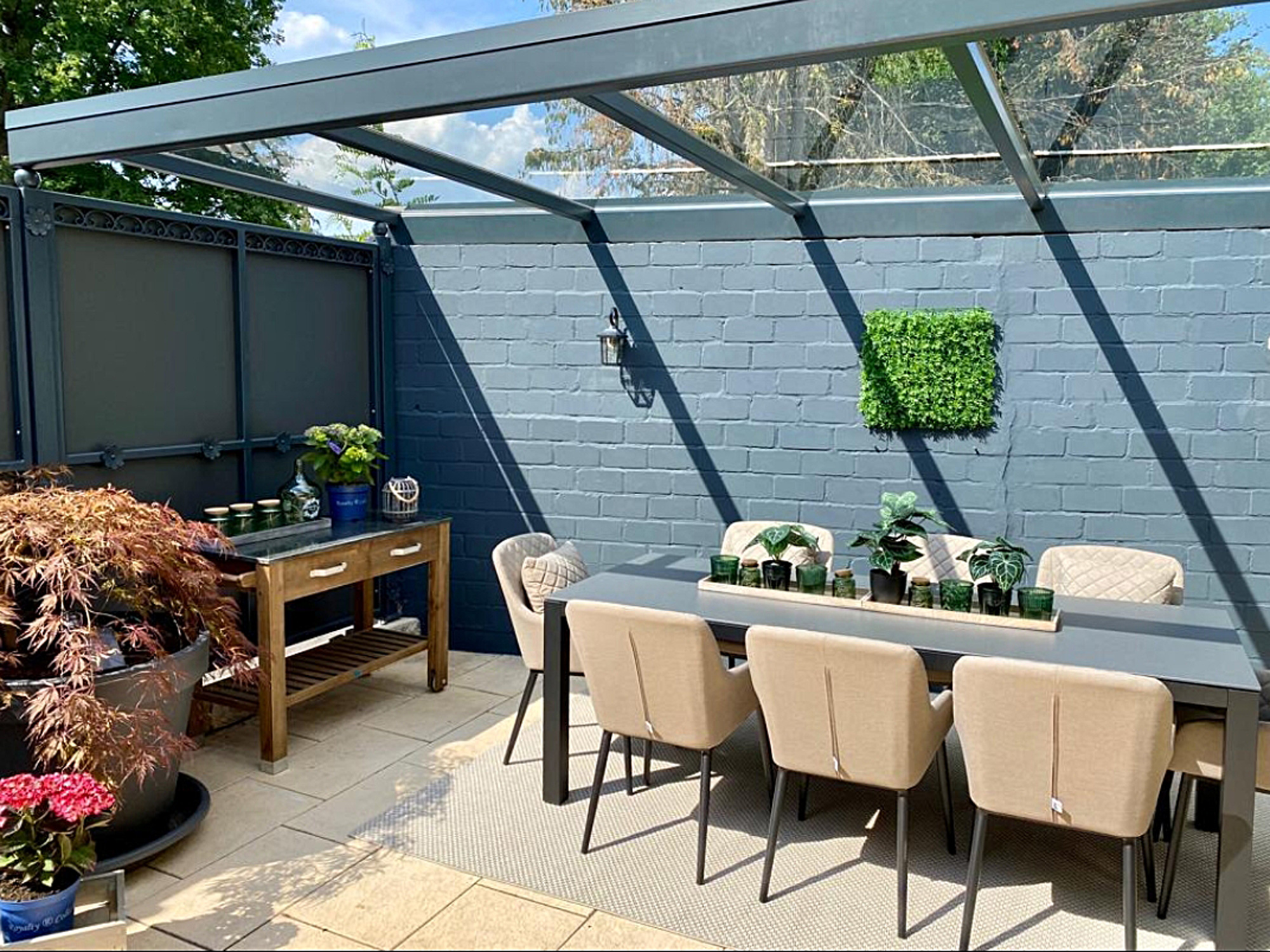 Das pulverbeschichtete Vordach mit anthrazitfarbener Optik und Glasdach schließt direkt an den Eingang des Hauses an. Durch die neue Trennwand gestützt entsteht ein geschützter Outdoor-Bereich. Mit verspielten Details an der Oberkante sowie Sprossen und kleinen Blumen-Ornamenten harmoniert die Trennwand mit dem neuen Balkongeländer. Denn auch hier finden sich die kleinen Blumen wieder – ein wahrer Wiedererkennungswert.