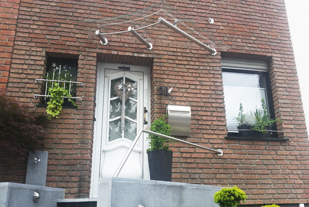 Die individuelle Vordach-Anfertigung passt zu Edelstahlgeländer und Fenstergitter, die ebenfalls von Nappenfeld gefertigt wurden. Zusammen mit dem neuen Granit-Aufgang verleihen sie dem Hauseingang ein modernes und einladendes Aussehen.