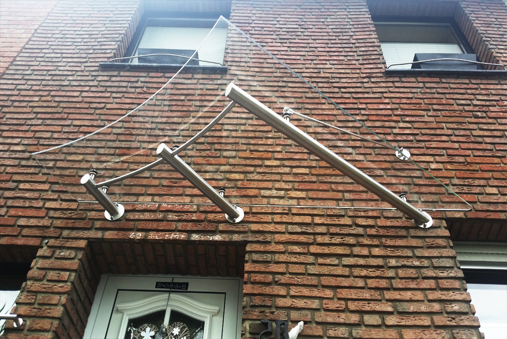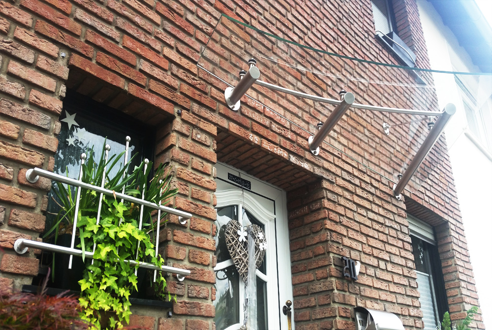 Ein Vordach aus Edelstahl in Kombination mit klarem Sicherheitsglas entwarf und montierte Nappenfeld an einem Einfamilienhaus. Die maßangefertigte Konstruktion ist sowohl nach oben gerundet als auch schräg geschnitten.