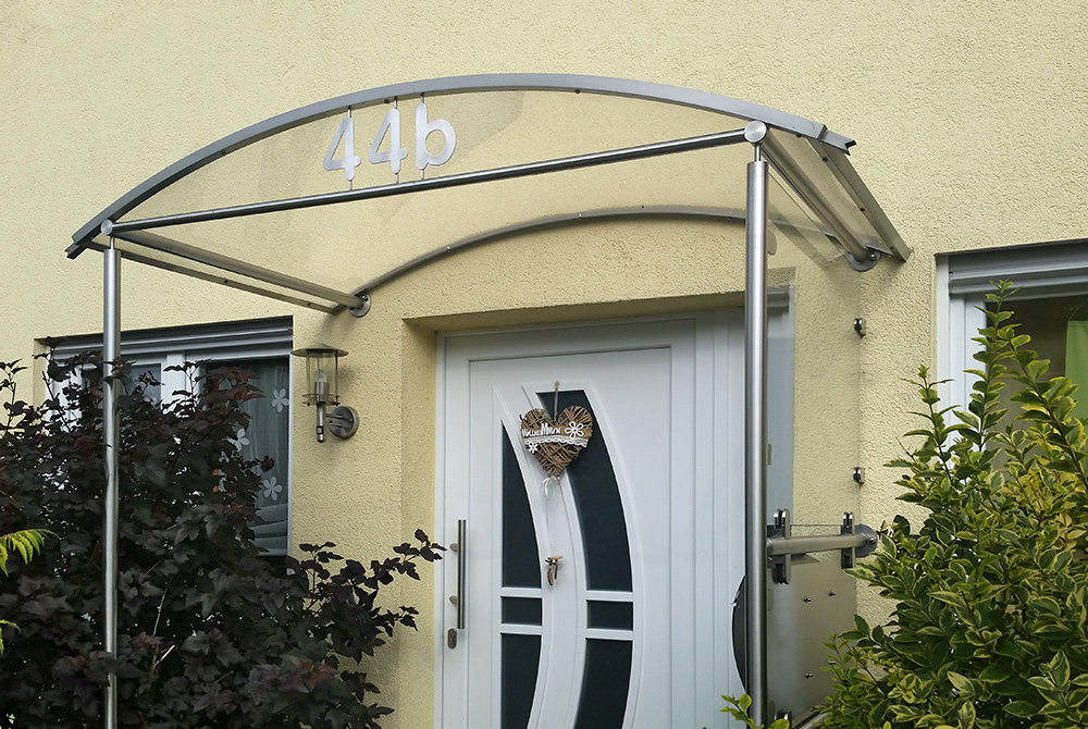 Für ein Einfamilienhaus in Mülheim hat Nappenfeld eine Vordachkonstruktion entworfen und realisiert. Das Vordach aus Edelstahl in Kombination mit Plexiglas ruht auf zwei Stützen, die in den Boden eingelassen wurden. Die Besonderheit: Der Briefkasten wurde in die Seitenwand aus Plexiglas, die auch als Windschutz dient, integriert. Diese schlichte und dennoch moderne Eingangsanlage überzeugt durch die zusammenhängenden Details in der Konstruktion.