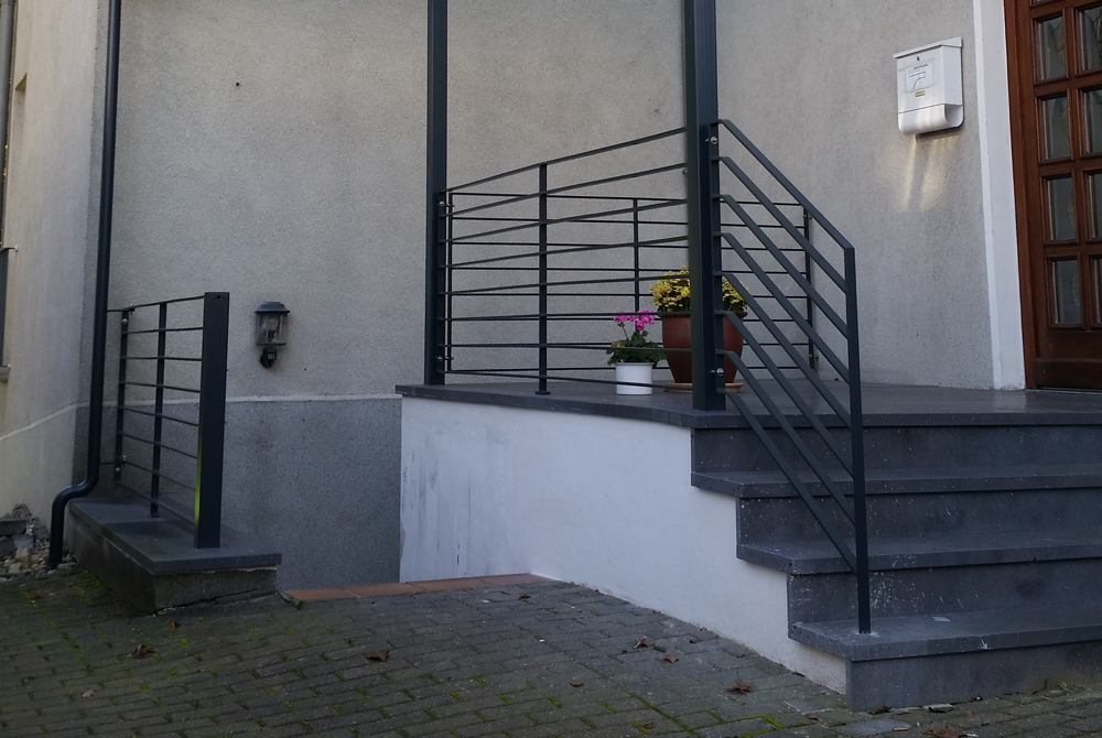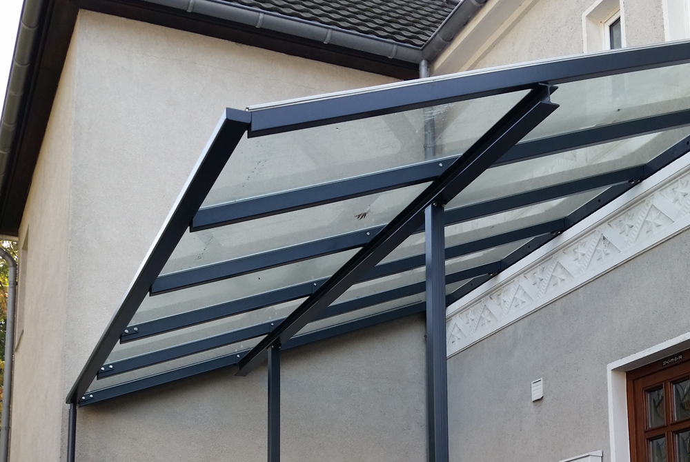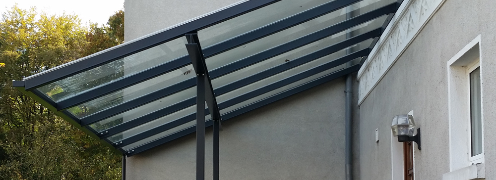 Eine verlängerte Vordachkonstruktion mit Überlänge von einem Meter fertigte Nappenfeld in Mülheim. Die Konstruktion besteht aus pulverbeschichtetem, verzinktem Stahl in Kombination mit Sicherheitsglas.