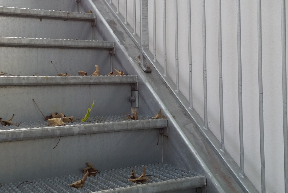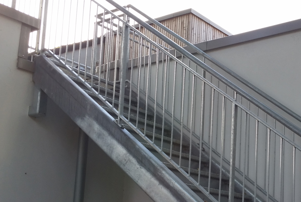 Die Architektin Jutta Heinze zeichnete und entwarf diese Fluchtwegtreppe für eine Kindertagesstätte in Duisburg-Neudorf-Ost. Nappenfeld setzte die Entwürfe fachmännisch um. Die Treppe wurde mit Hilfe eines Podestes in die Gesamteinlage eingefügt. Architektonisch super gelöst! Nappenfeld sagt Danke für die gute Zusammenarbeit.