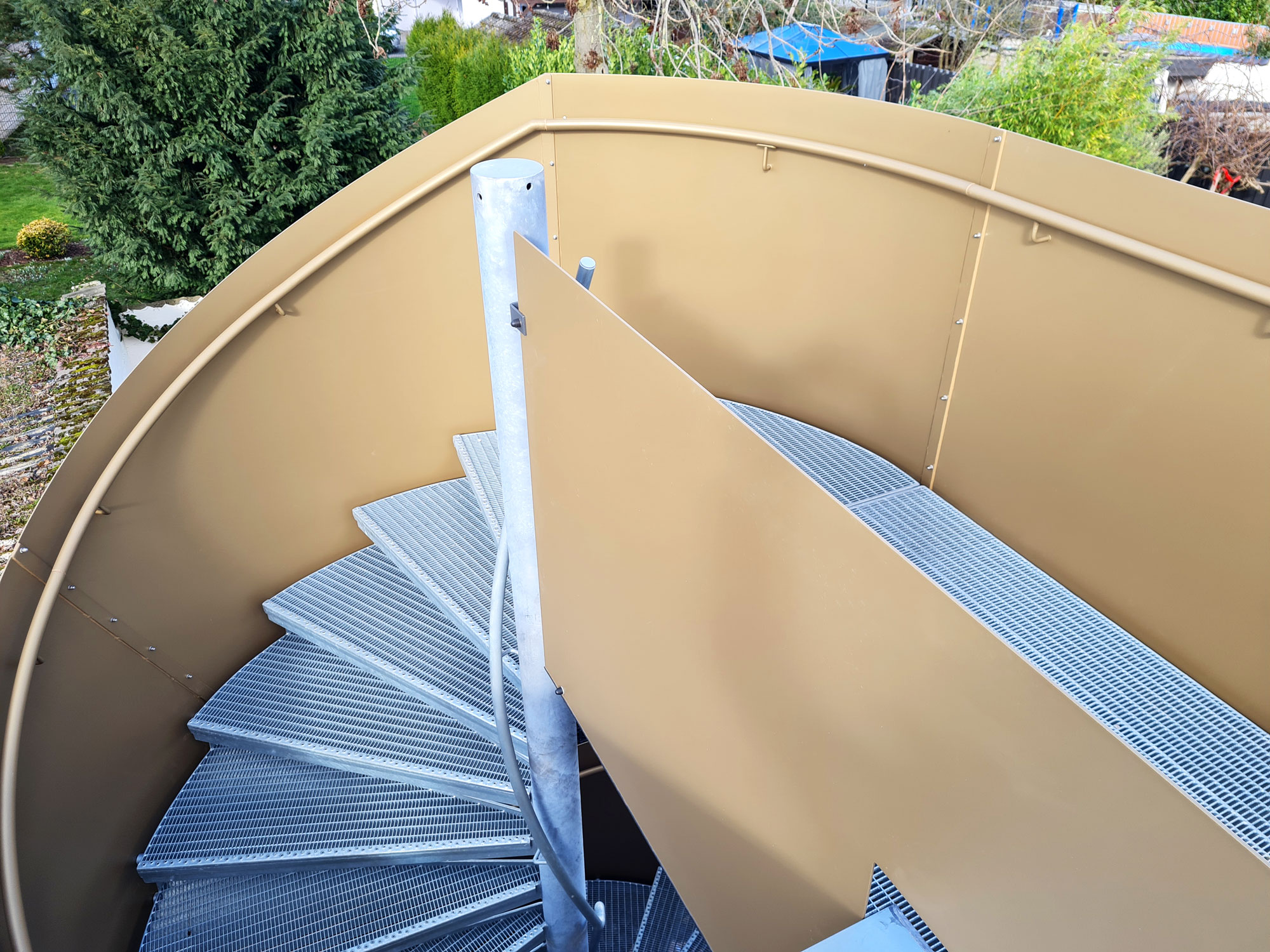 Die Kunstwerkstatt Turmstraße in Monheim hat eine neue Fluchttreppe – und was für eine! Mit 6,5 Metern Höhe, einer Breite von 2,3 Metern und 2,2 Tonnen Gewicht ist die Rundtreppe aus der Edelstahlschlosserei Nappenfeld ein echter Koloss. Herausragend sind bei diesem Meisterwerk des Treppenbaus nicht nur die Ausmaße: Alle Segmente wurden von Nappenfeld mit Goldpulver beschichtet! Und auf den Millimeter genau handgefertigt und vor Ort montiert.
