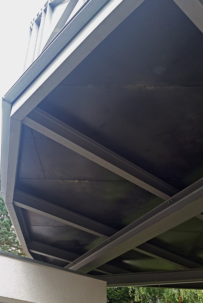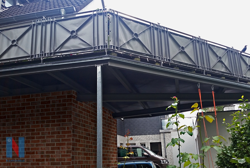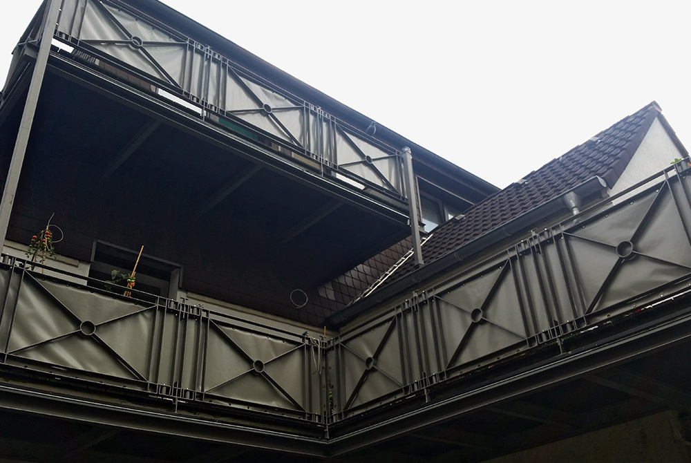 Nappenfeld realisierte einen riesigen Stahlbalkon in Mülheim an der Ruhr. Die verzinkte und in DB 703 nasslackierte Konstruktion verläuft um das Haus herum und ist statisch auf einen Punkt zulaufend. Zusätzlich wurde eine weitere Balkonetage für eine Einliegerwohnung gefertigt.