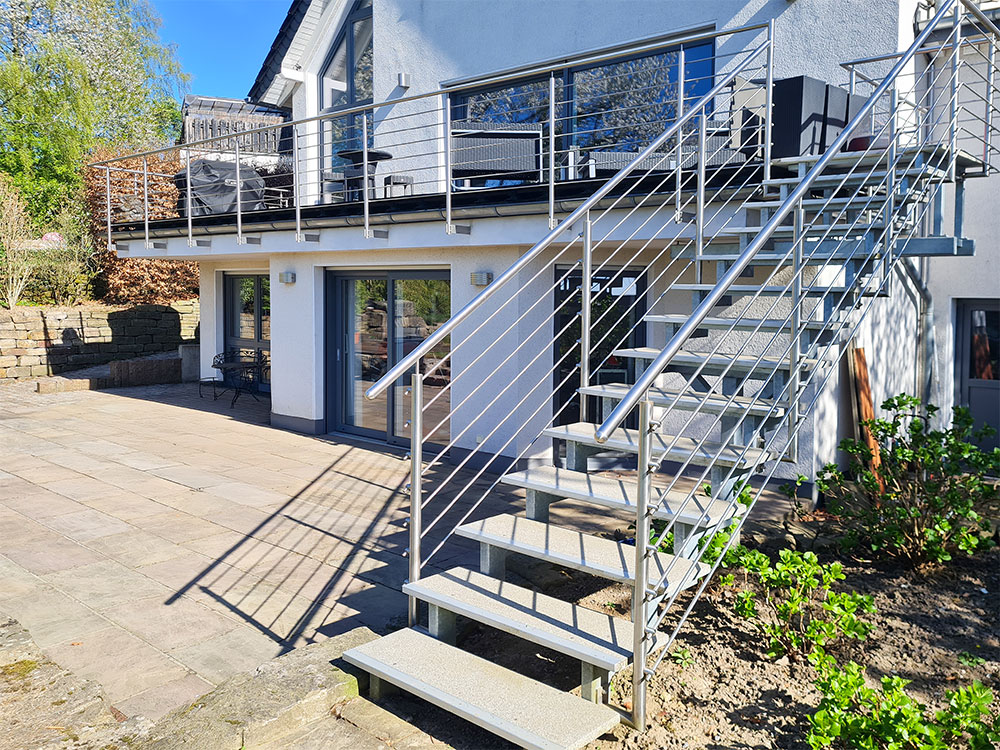 Optimale Erschließung des Obergeschosses bietet die neue Stahlkonstruktion der Edelstahlschlosserei Nappenfeld in Dortmund. Die verzinkte Außentreppe mit Balkoplan-Stufen führt zu einem großzügigen Balkon mit elegantem Edelstahlgeländer. Die horizontalen Füllstäbe sorgen für moderne Optik und ungestörten Ausblick. Gleichzeitig verbindet die robuste Konstruktion Funktionalität mit zeitgemäßem Design und erweitert den Wohnbereich nach außen. Die Profis der Bauschlosserei Nappenfeld haben das Projekt von der Planung über die Fertigung bis zur fachgerechten Montage betreut.