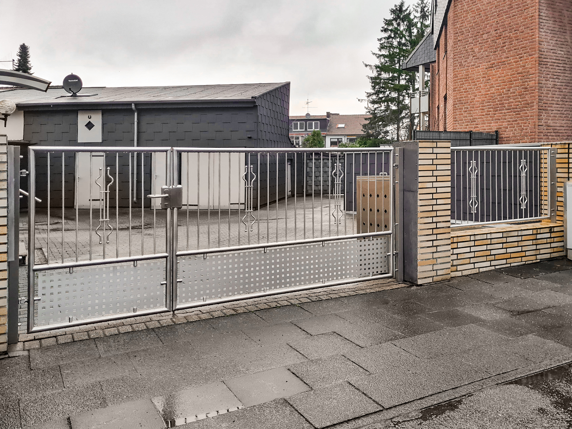 In Duisburg wurde ein zweiflügeliges Tor aus Edelstahl installiert. Besonderes Augenmerk galt dem unteren Bereich des Tores, der mit Lochblech versehen wurde, um den kleinen Hund des Kunden sicher im Grundstück zu halten. Zusätzlich haben die Profis von Nappenfeld zwei seitliche Zaun-Elemente im gleichen Stil montiert. Die Edelstahlschlosserei Nappenfeld übernahm auch bei diesem Projekt den gesamten Prozess von der Planung und Fertigung bis zur Lieferung und Montage.